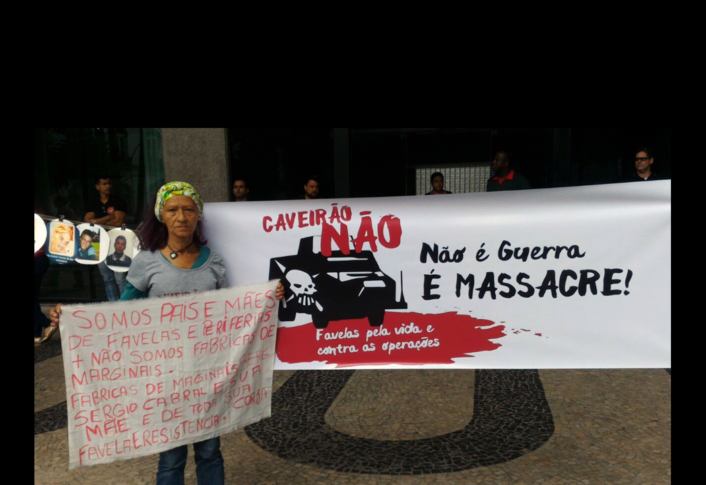 “A campanha “CAVEIRÃO NÃO! Favelas pela Vida e contra as Operações”, organizada por movimentos sociais, mães e familiares de vítimas de violência policial, movimentos de favelas, organizações de direitos humanos e ativistas, vem, por meio desta carta, convocar o Ministério Público Estadual a cumprir o seu dever constitucional, realizando o efetivo controle externo da atividade policial, de modo a coibir as práticas violentas em operações policiais nas favelas. De janeiro a outubro de 2017, os números de homicídios cometidos pelas polícias do Estado do Rio de Janeiro chegaram a 910 mortos, numa média de três mortos em operações policiais por dia. Exigimos celeridade e eficiência por parte do MP para inibir novas operações violentas, com uso dos caveirões aéreos e terrestres, bem como para promover a investigação de violações de direitos perpetrados por agentes do Estado contra a população negra, pobre e favelada.