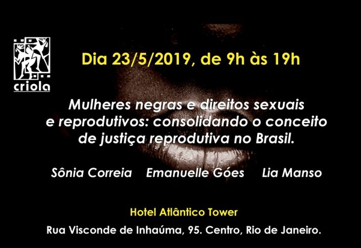 Nesta quinta-feira, dia 23 de maio, a partir das 9h, acontece no Hotel Atlântico Tower (rua Visconde de Inhaúma, 95, Centro, Rio de Janeiro), o evento Mulheres Negras e direitos sexuais e reprodutivos: consolidando o conceito de justiça reprodutiva no Brasil. Estarão reunidas as especialistas Sônia Correia, Emanuelle Góes e Lia Manso, de Criola. A participação é gratuita.