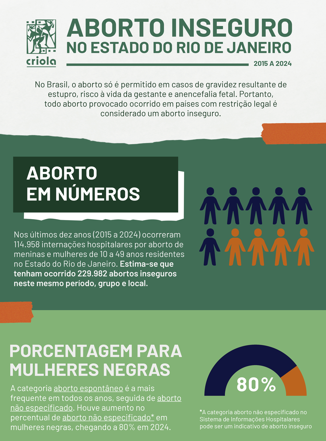 Os dados reunidos por Criola neste infográfico comprovam: meninas e mulheres negras são as principais vítimas do aborto inseguro no Brasil. Nos últimos 10 anos, estima-se que tenham ocorrido quase 230 mil abortos inseguros no estado do Rio de Janeiro. Em 2024, 80% dos abortos em mulheres negras foram registrados como “não especificados”, um dado que escancara a subnotificação e a vulnerabilidade a que estamos submetidas.