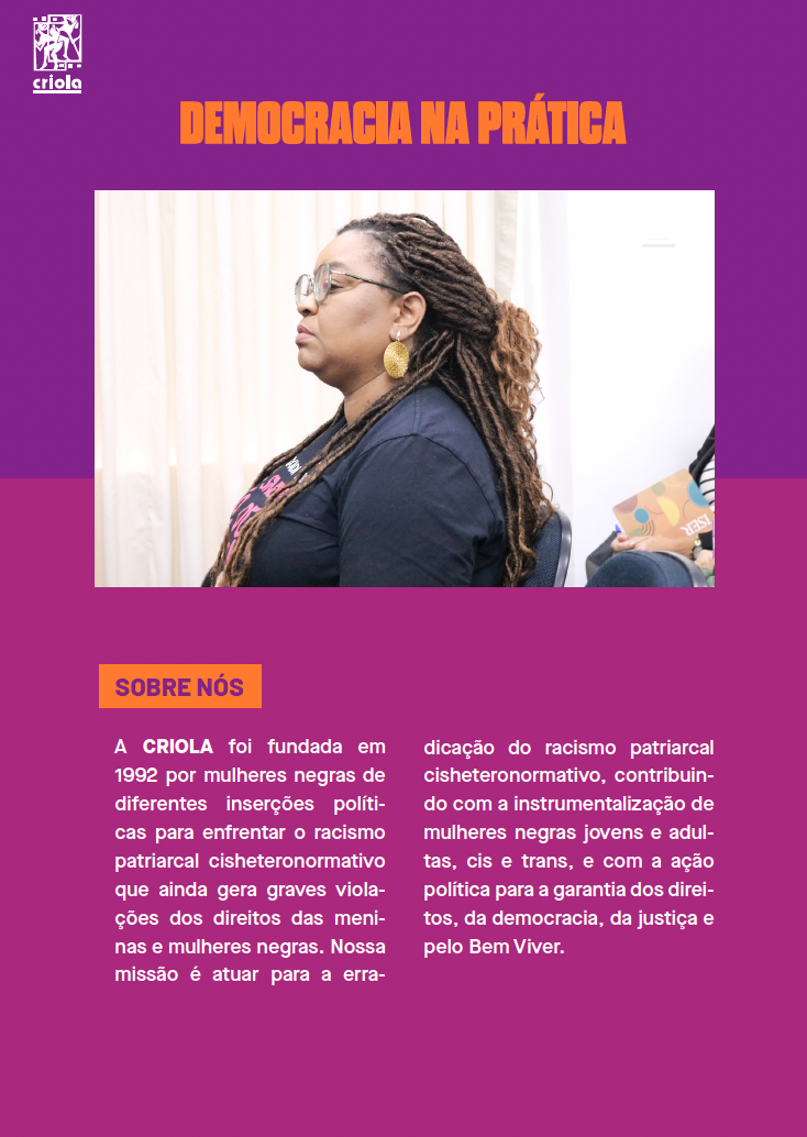 Com objetivo de ampliar as capacidades das organizações de mulheres negras cis e trans para o enfrentamento do racismo patriarcal cisheteronormativo, Criola apresenta com “Democracia na Prática” uma série de quatro informes para leitura e debate sobre o trabalhoso caminho para alcançarmos maior participação política de mulheres negras no espaço cívico em nosso país.
